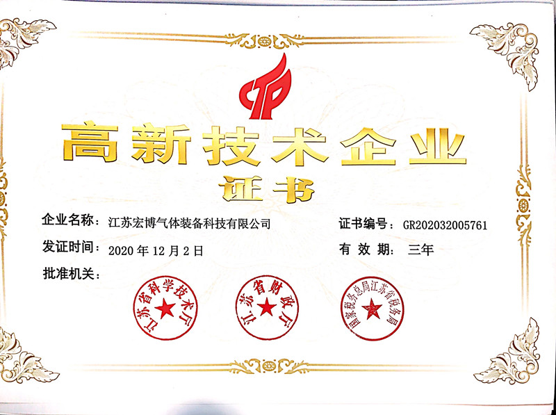 2020年,宏博企業(yè)江蘇宏博氣體裝備科技有限公司,生產(chǎn)基地-東臺宏博凈化科技有限公司同時獲評高新技術(shù)企業(yè),并于近日收到由江蘇省科學(xué)技術(shù)廳、江蘇省財政廳、國家稅務(wù)總局江蘇省稅務(wù)局聯(lián)合頒發(fā)的《高新技術(shù)企業(yè)證書》。