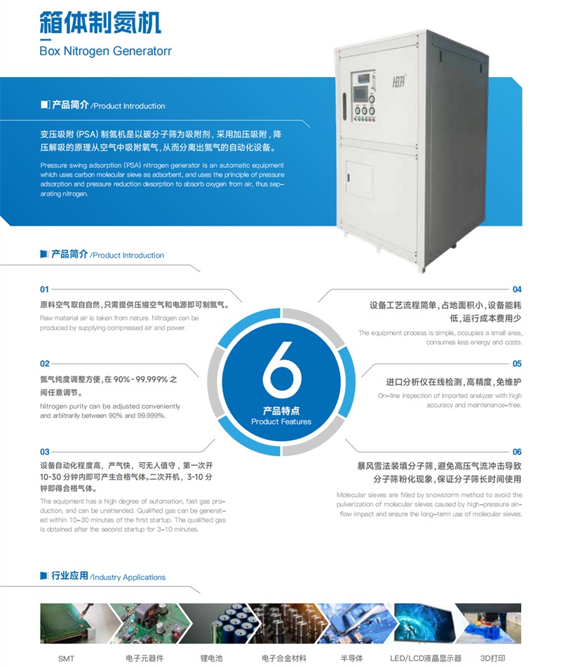 環(huán)境空氣經壓縮凈化,除去油、水、塵后,進入由兩個裝填有碳分子篩的吸附塔組成的變壓吸附裝置。壓縮空氣由下至上流經吸附 塔,其間氧分子在碳分子篩表面吸附,氮氣由吸附塔上端流出,進入粗氮緩沖罐,經過一段時間后,吸附塔中碳分子篩被吸附的氧飽和,需進行再生。再生是通過停止吸附步驟,降低吸附塔壓力來實現的。兩個吸附塔交替進行吸附和再生,從而確保氮氣的連續(xù)輸出。